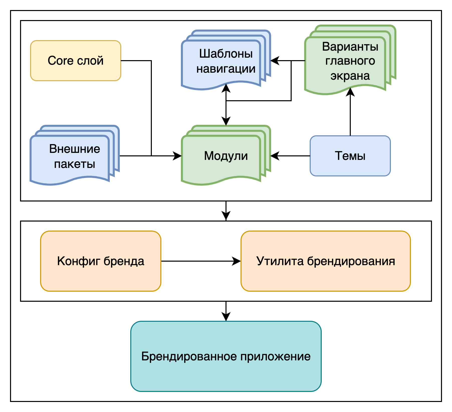 core, в котором будут лежать сервисы и ресурсы, доступные любым модулем напрямую, через service locator или контекст - Все что можно структурировать и выделить в отдельные пакеты — выводим (HTTPS-клиент, дизайн-система, слой данных и прочее)