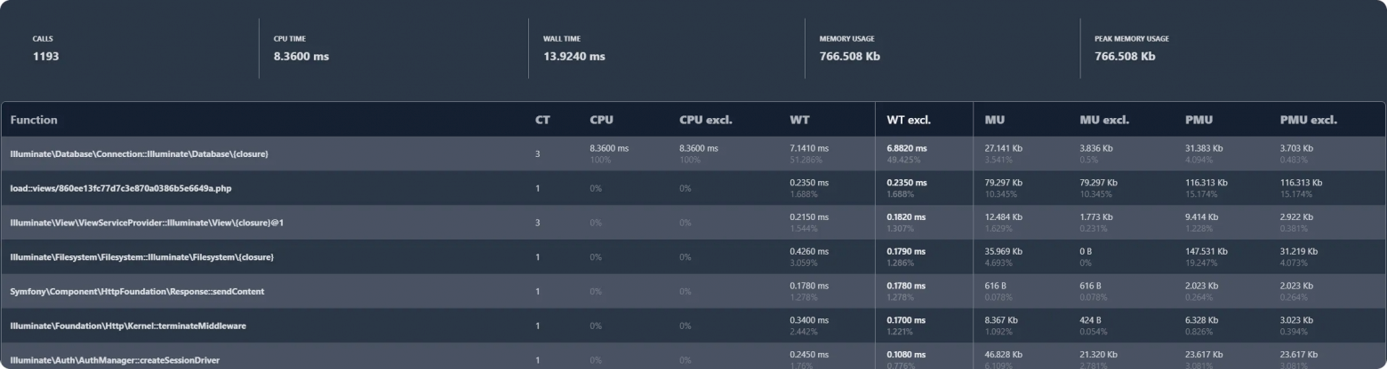 - Время выполнения функции (Wall Time) — включает в себя не только время выполнения кода в PHP, но и время ожидания операций ввода-вывода, работы с сетью, базами данных и других внешних сервисов