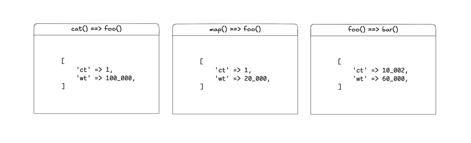 В стеке cat()->foo() был один вызов и wall time 100 мс.