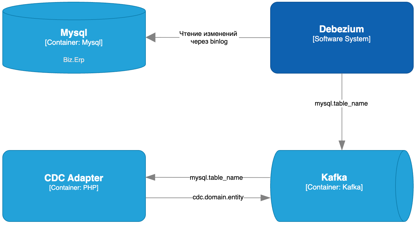 CDC-адаптер подписывался на топики Kafka, получающие события от Debezium. Для каждой сущности: