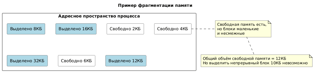 Фрагментация памяти — это явление, при котором большая часть памяти распределена в виде большого количества несмежных блоков или чанков. Это оставляет значительный процент общей памяти нераспределённой, но непригодной для большинства типичных сценариев