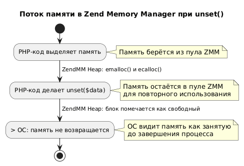 Peak: 17185536 (PHP), 18878464 (real)Здесь после unset() значение memory_get_usage(false) упало почти к стартовому уровню (освобождённая память пошла во внутренний пул), но memory_get_usage(true) осталось на ~19 МБ (OS-допамять не отдана обратно). Это соответствует тому, что ZendMM «вернул» память в своё хранилище, но не вернул её системе. При этом memory_get_peak_usage() показал пиковые 19 МБ, которые уже не сбрасываются. Именно так и проявляется оптимизация ZendMM: он позволяет быстро перераспределять память в PHP, но не допускает случаев, когда процесс вдруг внезапно вырастает за счёт неограниченных malloc.