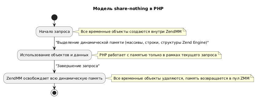 В PHP используется модель share-nothing, что означает полную изоляцию состояния между запросами. Каждый HTTP-запрос работает с собственной памятью и объектами, а все временные данные создаются заново и автоматически очищаются по завершении запроса. Такая модель упрощает управление памятью, делает поведение предсказуемым и снижает риск утечек между запросами.
